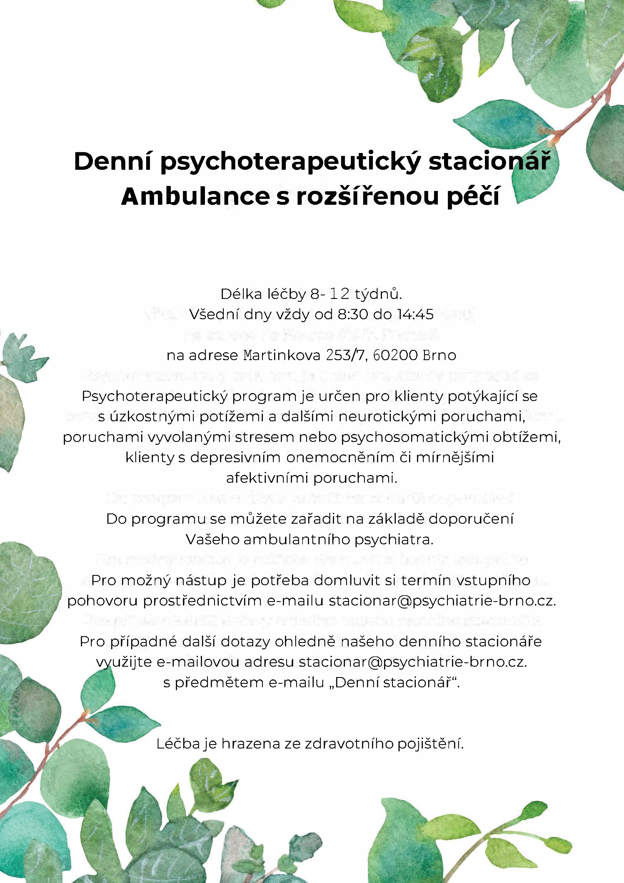 Denní psychoterapeutický stacionář představuje intenzivní formu ambulantní léčby pro dospělé. Stacionář poskytuje každodenní psychologickou péči bez nutnosti hospitalizace, hrazenou ze zdravotního pojištění. Je určený klientům potýkajícím se s úzkostnými, depresivními či psychosomatickými obtížemi, případně jinými afektivními poruchami. Náplní programu je především skupinová psychoterapie.
